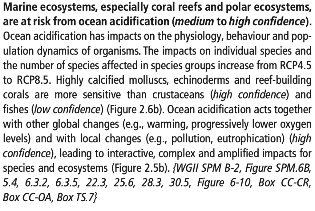 For readers interested in going deeper on the sensitivity of corals to threats under climate crisis, here’s a recent Nature Climate Change article that I found really interesting. And for all, here’s a little of what AR5 had to say about coral: