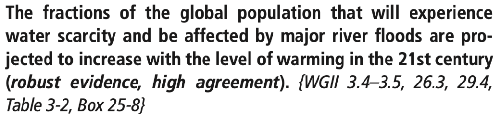 A previous post highlighted freshwater consumption as a key planetary boundary; unfortunately, multiple intersecting aspects of climate crisis are now converging to reduce the availability of safe drinking water across much of the world, including in heavily populated parts of South Asia, North Africa, and western North America. As AR5 puts it: