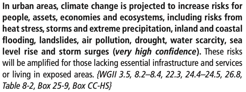 Although droughts, floods, heat waves, and water scarcity have all already been addressed in previous posts, given that more than 50% of the human population globally already lives in urban areas (with the UN projecting that nearly 70% may live in such areas by 2050), the specific threats that climate crisis poses for cities merit just the sort of specific attention that AR5 gives them: