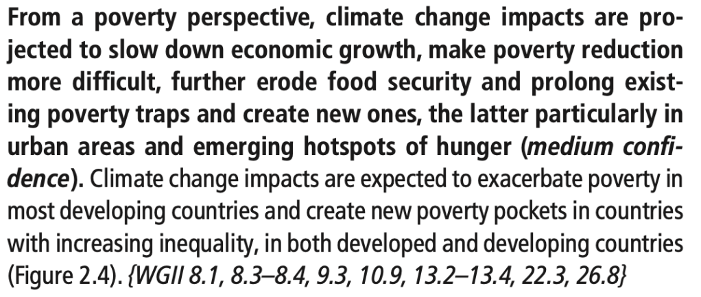 Taken together, these multi-faceted threats to urban and rural communities globally are very likely to cause radical deterioration in the quality of life of billions of people, with the poor and socially marginalized at greatest risk of losing livelihoods, shelter, access to education, etc., etc. In this sense, the COVID-19 pandemic – with its rolling social, economic, and political impacts – can be seen as a modest dress rehearsal of what climate crisis may bring, even in optimistic scenarios, as class divisions are exacerbated and the world’s poor suffer disproportionate harm from catastrophe. In short, progress towards the the reduction of poverty (itself, often enough, a specious artifact of arbitrary definitions set by multilateral agencies) is likely to be reversed. Here’s another AR5 excerpt: